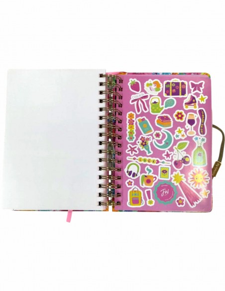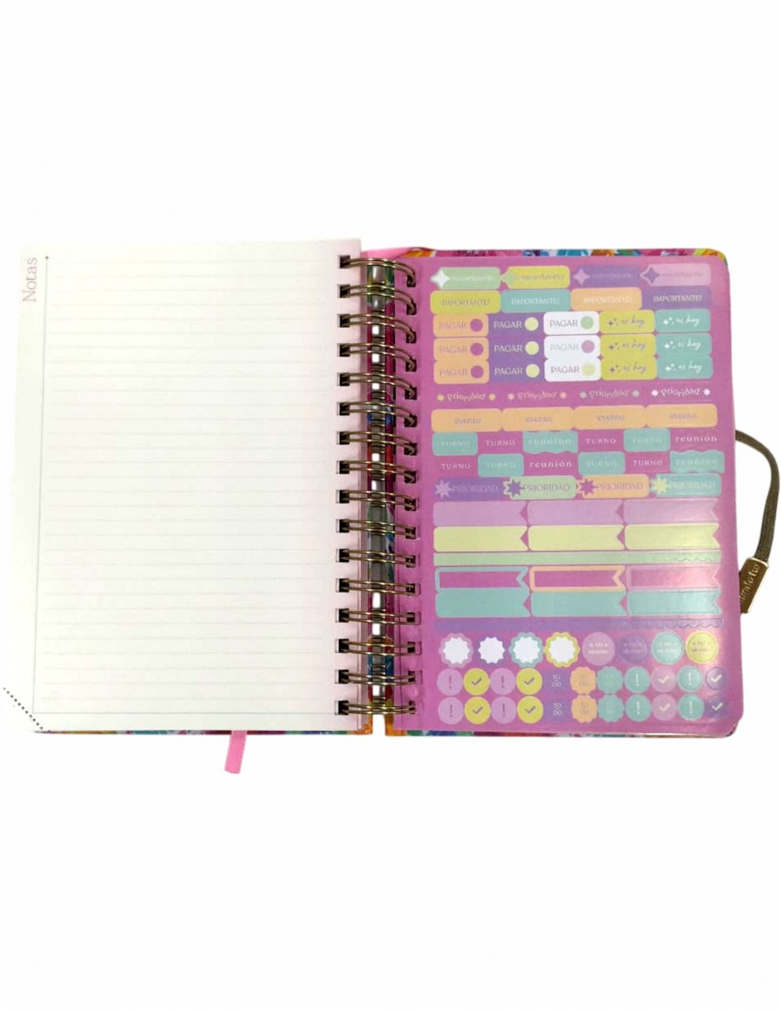 Extras: 2 hojas de stickers, sobre interno, elástico de cierre y troquel señalador.