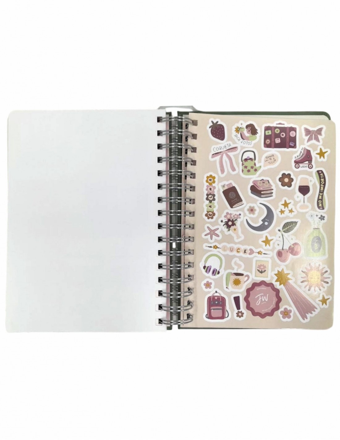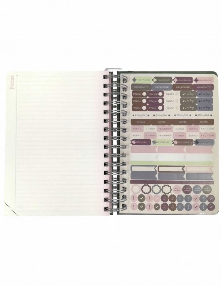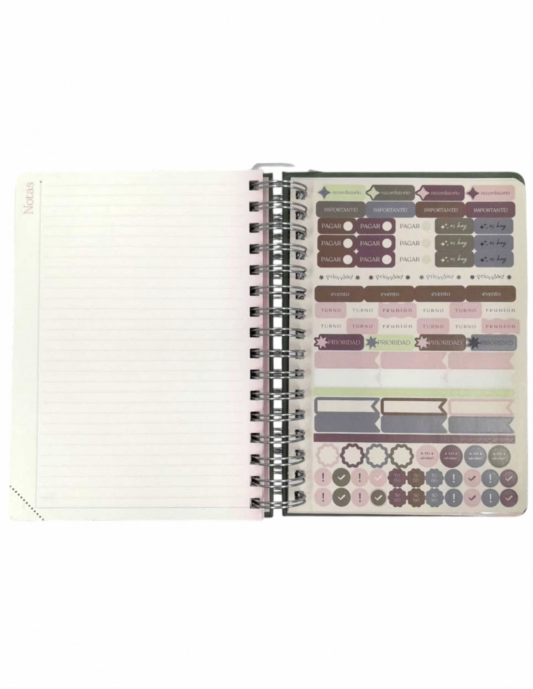 Extras: 2 hojas de stickers, sobre interno, elástico de cierre, charm y cinta señaladora.
