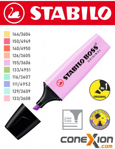 - El clásico resaltador STABILO BOSS, ahora cuenta con 14 nuevos colores pastel, suaves y modernos, que le darán a tu trabajo un aspecto sutil pero elegante.