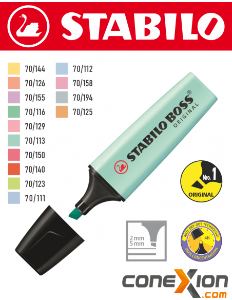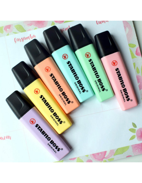 - El clásico resaltador STABILO BOSS, ahora cuenta con 14 nuevos colores pastel, suaves y modernos, que le darán a tu trabajo un aspecto sutil pero elegante.