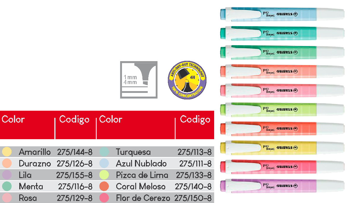 - Tecnología Antisecado STABILO: puede permanecer destapado por 4 horas sin secarse.